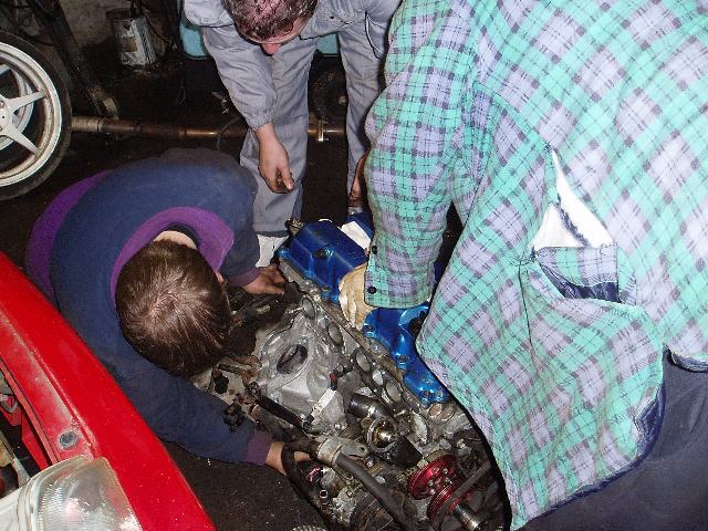 Quotes From The Team None of this would have been possible without the team and it's only right they have a say in this too. So here we are, with quotes from the team including a cracking account of the day from Daz: Disco Nabber Lurch Onto the day itself, well after hours of promising shopping trips, restaurant meals and massages on demand I managed to convince my girlfriend to give me a lift up to Kendal. I sold my GTLE the other week and no replacement as of yet! Got there after Ant who decided to leave at some ridiculous hour of the morning to get there at 8am! Waited for Nabber and Dave to turn up and wasn?t too long before the crew was together. Had a hot beverage and set off down to the farm where the car was stored. I jumped in Ants amazing talking car and followed Stevie. Well we got there, unpacked the donor engine, unpacked Ants lift and some tools. And then ummed and arred about how to position the car, decided just to nudge the front end into the barn. Brakes were locked on so had to give the car a bit of a helping hand courtesy of an Astra estate with a tow bar! And used the same arrangement to get the car in position. Once the car was in then it was time to sort out tools and crack on. First job, crack the wheel nuts and jack it up. Wheels off and probably the easiest job of the day. Then it was time to crack the hub nuts. Offside, bit of effort and it went and came off without hassle. Well the breaker bar then got passed to Dave to attempt the nearside and what did the brute do? Shatter the thing to smithereens! Doesn't know his own strength. Luckily Ant brought two bars with him. So with a bit of brute strength and ignorance the hub nut finally gave up. Then a simple couple of bolts to get the top links and the bottom suspension undone to pull the CV joints out. I must admit I would have been slightly more productive if I would have had my brain switched on and stopped tightening the bolts up and so the piss taking between all of us began! CV joints finally out after a bit of wiggling, swearing, pleading, kicking and crying, and it was decided to drop the whole thing as one, gearbox and driveshafts all attached. So we just left them. Now to jack the car up even more so we could get access to the last bits attaching the engine to the car. Well because of the uneven yard outside the barn, when we jacked the front up the exhaust was close to grounding out. So we had to chock up the back end to jack the front up. Another timely delay but necessary. Time to get underneath the car and start getting bits off. Centre section of the exhaust was one of the first things to be removed. I managed to draw the short straw and was the first to get on my back. I don't know who did them decat bolts up but whoever did needs a slap. There were some almighty groans coming from underneath the car. I swear I felt a hernia coming on at one point too, but I prevailed, eyeful of rust and all. Then a couple more bits needed doing. Including draining the power steering fluid which was so excellently directed through a narrow gap by myself. Then Dave got rid of his barn floor virginity by undoing the gear linkage and the back bolts on the bottom strut bar. He valiantly tried undoing the fronts but some muscles were needed for that one ;). Some penetrating liquid was sprayed on the captive nut sides in the front bulk head. Ant cleverly sprayed it whilst no one was sat in front of the car trying to undo a bolt. Dave on the other hand failed to realise this and it had to be me sat in front of the car, mouth wide open due to the fact I'm unfit and blowing out my bumhole while trying to undo this bloody bolt and took a dirty great squirt of the penetrating liquid. Yum! Nabber was taking a more restrained approach to engine swapping and was content copper greasing to within an inch of their lives, any bolt he could lay his hands on. Any last bolts or wires, cable or plumbing were disconnected and time to drop the engine. Out came the engine crane and ant strapped the engine up. The jack placed underneath it for stability. Out came the mounting bolts and down she went. We slid it out from underneath the car and started swapping over all that needed swapping. The engine Stevie got was stripped pretty bare so a lot had to be carried over. Pulleys, oil pump brackets etc were the first easy things to sort and swap. Then it was a case of splitting the gearbox. STOP?.. Sausage and bacon butties followed by chocolate muffin and hot chocolate all with a hint of penetrating liquid (I'm not going to let this lie!) I worked through my dinner break as I am young and eager, while the old fogies needed time to sit back and relax a little. The driveshafts were detached from the block and the gearbox was split and this was when Nabber got stuck in and got his gloves really dirty. Actually you couldn't stop him after this point! He split the gearbox like a beauty so a natural born mechanic. Flywheel and clutch were the next things to come off and be swapped over. After the teeth on the flywheel were cleaned up it was onto the new engine with that and my crap alignment skills! About 7 attempts later the flywheel on and getting torqued up. Clutch plate and pressure plate were next to go on with ant and his makeshift clutch alignment tool. Gearbox back on and back together with a bit more wiggling cursing and bashing! Bolted up and secured. More mounting points attached, driveshafts fixed back into position. Starter motor attached, alternator on and belts and pulleys sorted. Things started to get a bit more relaxed as the harder bits had been tackled. The water hose was sorted, aligned and fixed into position. Ant went outside to get the inlet manifold to get the last bit attached to the engine to get it ready for the big lift. After a couple of weeks of sitting about you would have thought the water would have evaporated out of the inlet, well Ant was in for a shock. He tipped it up and out came a river! A few jokes later an